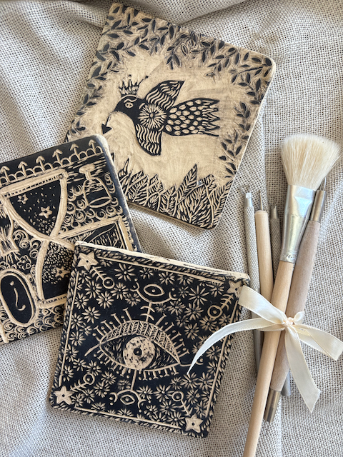 Ven a poner a prueba tu talento en dos soportes de gres blanco (cuadrados de 10 x 10 cm o redondos de 12 cm de diámetro) mediante una técnica de grabado (el esgrafiado).