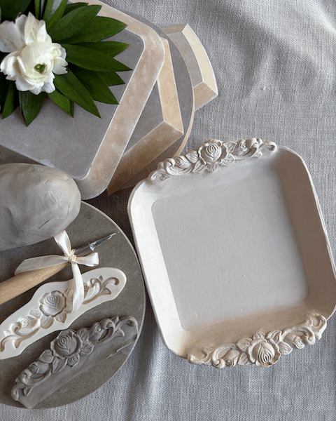 Taller de construcció de plats sobre moldes de fusta (quadrat, rectangle, octògon, cercle): podeu crear el vostre propi plat d'estil romàntic (hi ha disponibles una varietat de decoracions per personalitzar la vostra peça).